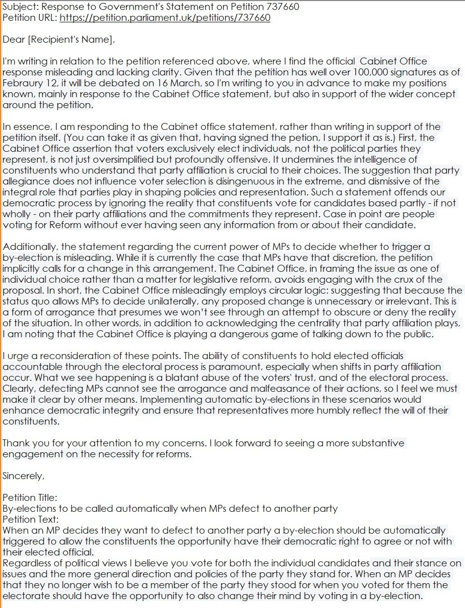 This is what started it all: the idea of posting a long-winded response to a UK Cabinet Office response to a petition about Members of Parliament who change their party affiliation after having been elected. Quite typically, petitions asking the government of the day to regulate themselves more effectively are dismissed, well, dismissively. For a moment, I was tempted to start a petition requesting the Cabinet Office to retract the statement it has made about this one. Then I thought I would write to my MP. This is the result - still in draft form.
